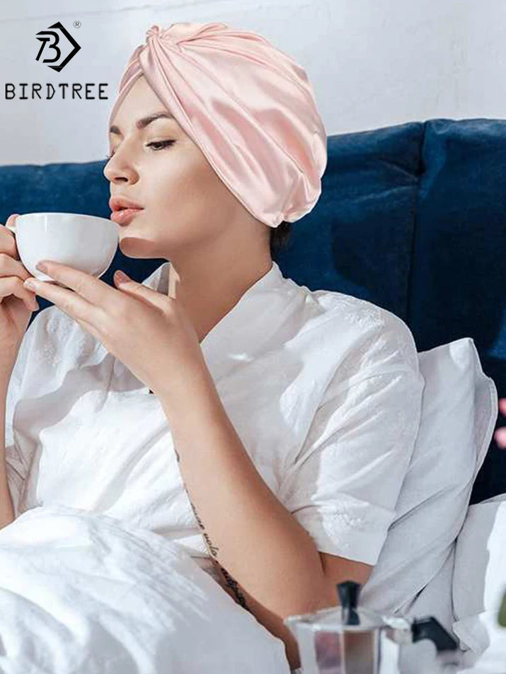Answer 2: The cap features a chic twisted design that ensures a snug fit, keeping it securely in place while you sleep and preventing any slipping or discomfort, so you can rest easy without worrying about your hair.